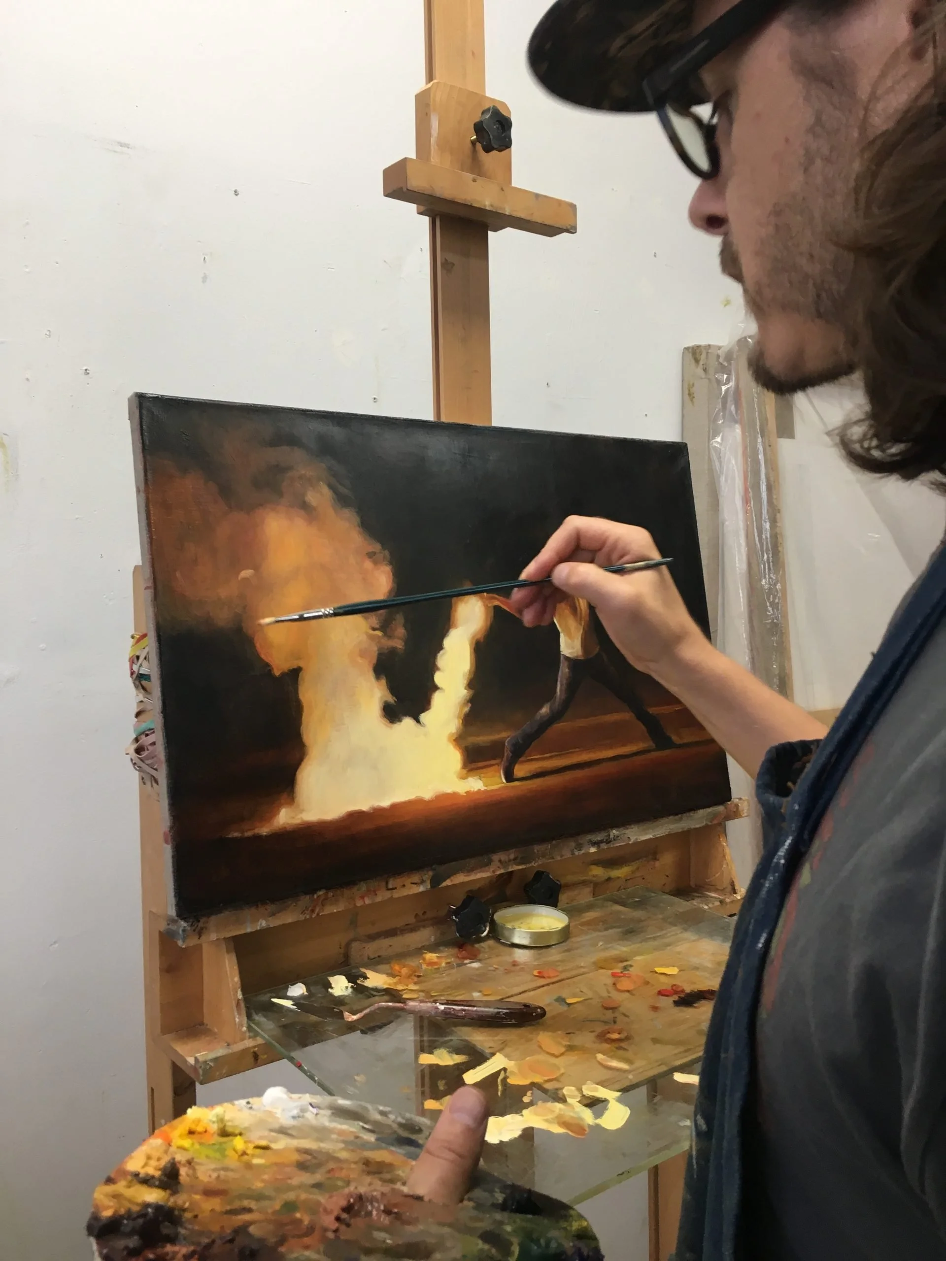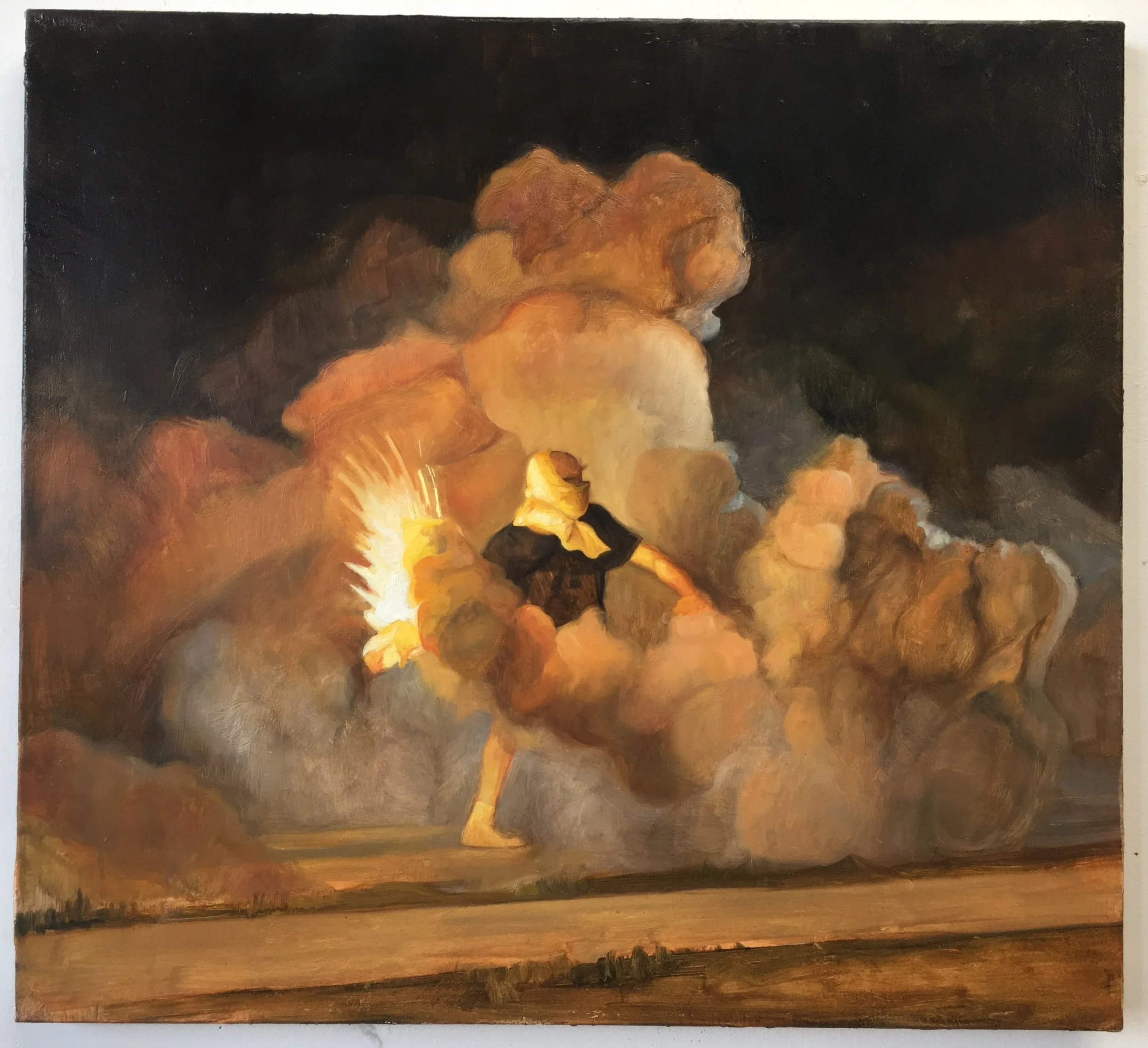 “In a sensuously visual regard, Molesky’s work recalls the Romantic painters of the late 18th century. Amorphous forms like fire, smoke, clouds, sea spumes, and light itself are a staple of his oeuvre, and provide ample surface area for painterly expression. As with the Romantics, the human figures in Molesky’s paintings seem hopelessly small in the face of nature’s fury, forever at the limits of their abilities as they abut mountains, seas, and in Molesky’s paintings, walls of smoke.