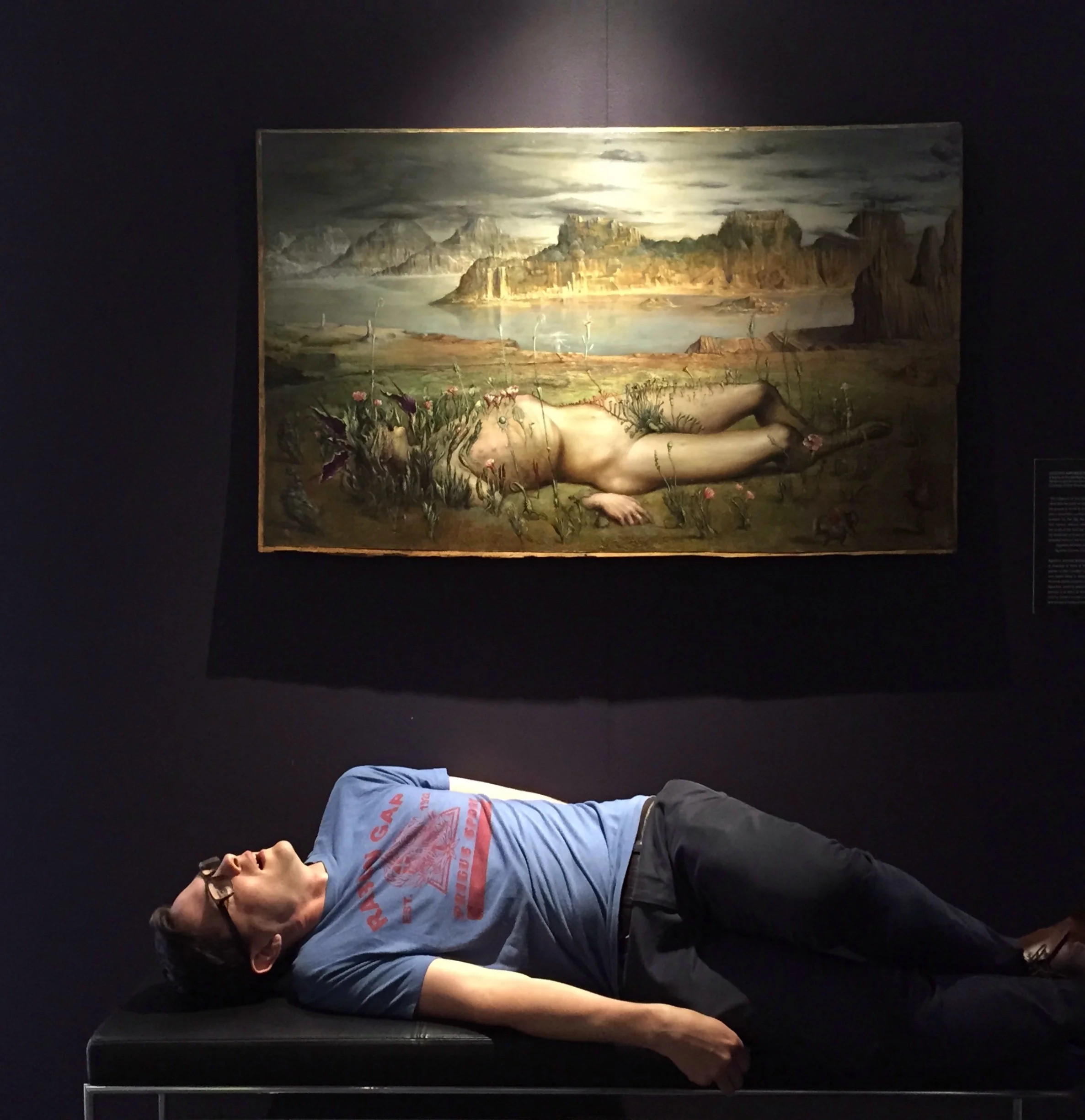 In Agostino Arrivabene’s Il sogno di Asclepio, man and the surrounding landscape are one. Asclepio, a son of Apollo, is dreaming by the shoreline of a lake ringed by mountains. Open-mouthed in mid-snore, he lies naked on his back. With each intake of breath, his body slowly metamorphoses into tendrils, vines and sepals. The dreaming mind of this Salvador Dalí-like figure is the next evolutionary step in the fight against climate change: to harm the natural world is equivalent to causing harm to the self.