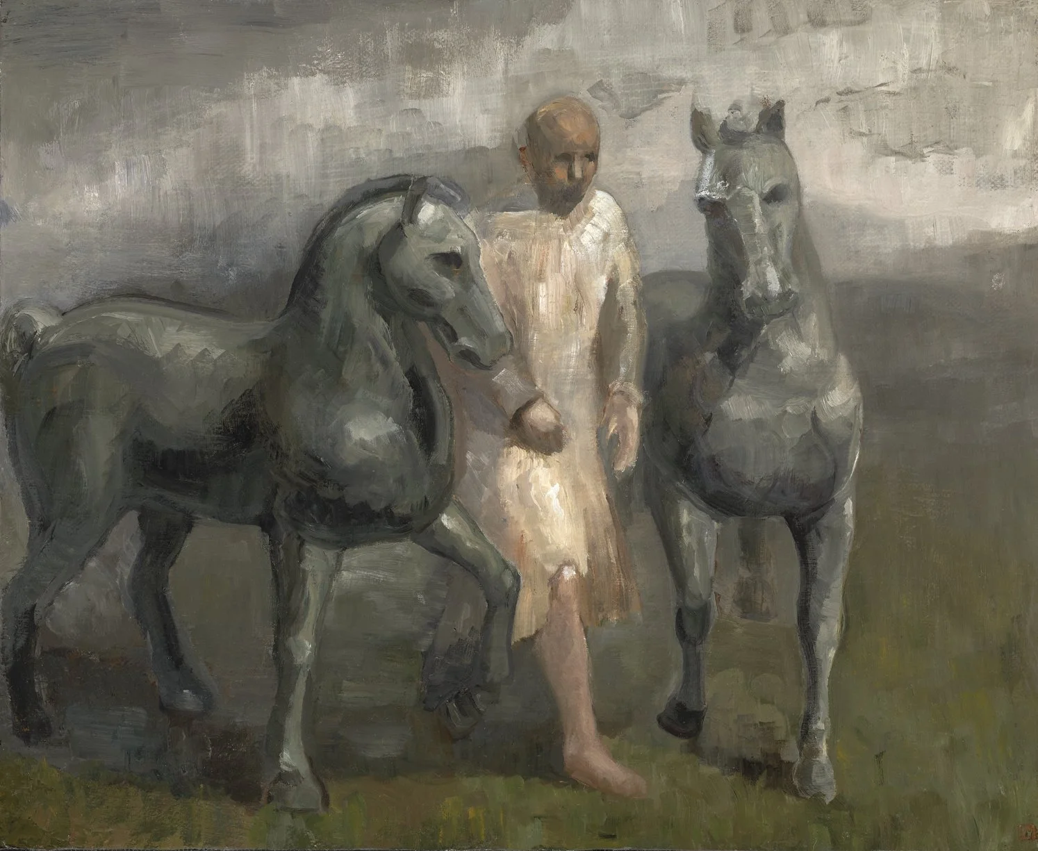 During the time I was apprenticed under Odd Nerdrum, he invited me to live at his house in Reykjavik, Iceland during the winter. It was a spooky place because there was no sunlight for a long time and he left me there by myself. That period in my life is another point I was exploring in ‘Man with Two Horses’ and some of the others in this show. The last thing that Odd said to me before he left me in the darkness there was that I needed ‘to go into a dark cave and look for a small dark flame.’ He was telling me that I could not count on the outside world for inspiration for my work and that I would have to look deep inside my mind and find it for myself.